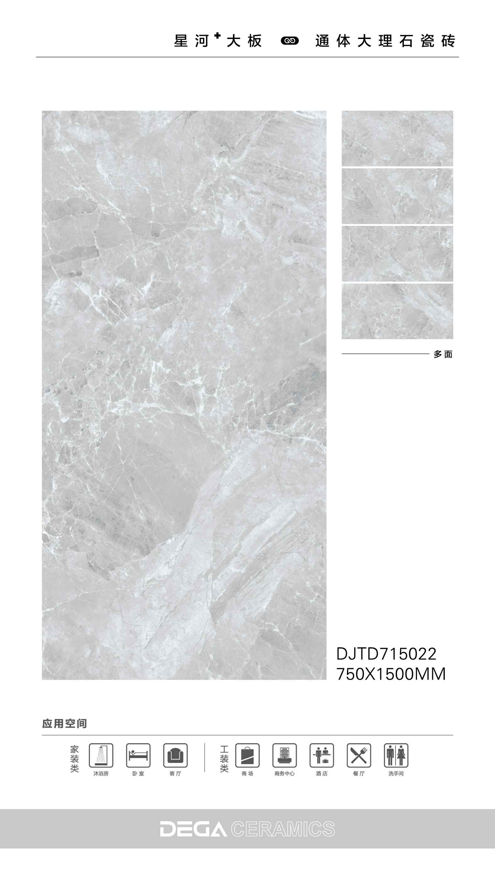 从规格形式的选择、纹理的趣味,到丰富内涵的表现、文化的传承等…… 都是她的每一侧面,在750X1500MM创造的舞台中央,是属于一片瓷砖传奇剧的演出。